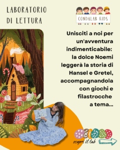 Laboratorio di Lettura: "Hansel e Gretel" con Noemi Unisciti a noi per un'avventura indimenticabile: la dolce Noemi leggerà la storia di Hansel e Gretel, accompagnandola con giochi e filastrocche a tema. Lasciatevi trasportare dalle parole e immaginatevi smarriti nel bosco, pronti a scoprire una casetta fatta di dolci...